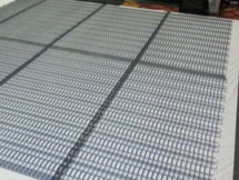 Galvanized steel. Available in 2 sizes: 6'x10' & 6'x12'. Rolls up for easy cleaning. Usually bought in pairs. Tyvek or similar product is used beneath the grids to catch the dirt from the dusting process. This prevents the rug from resting in the removed dirt.